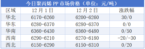 国内 PP 指数:据多多数据,12月2日国内PP现货指数为6286.00,上涨5点,涨幅0.08%。