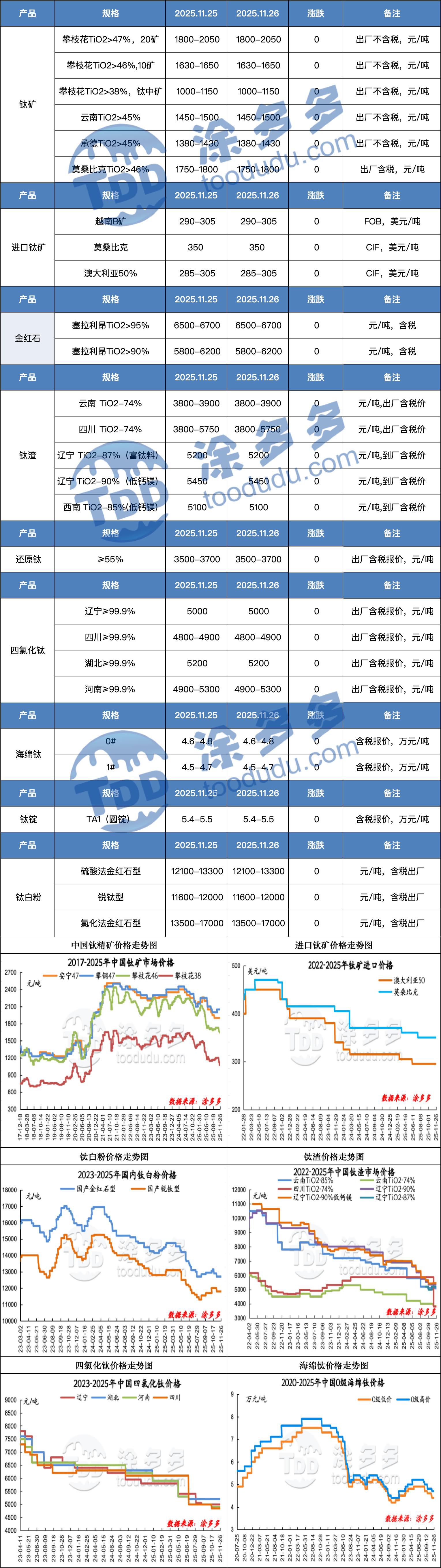 The Panzhihua-Xichang titanium ore price index remains unchanged at 1847.50 amid weak downstream demand, with miners cautiously monitoring market movements. In November, northern enterprises' high-titanium slag bidding prices rose slightly to 5,450 yuan/ton, yet overall market conditions remain sluggish due to shipping pressures for chloride-process titanium ore. Titanium tetrachloride prices stabilize between 4,800–5,300 yuan/ton as production and raw material costs remain steady. Sponge titanium prices hold firm, with Grade 1 at 45,000–47,000 yuan/ton and some Grade 0 reaching 46,000–48,000 yuan/ton; manufacturers maintain stable output despite high shipment pressure. The titanium dioxide index stands at 13,292.21, with sulfuric acid process producers signaling a potential 500 yuan/ton price hike due to high costs, while chloride process TiO₂ faces intense competition and elevated inventories. Despite mixed signals across segments, market stability prevails. TDD-Global connects global buyers with trusted Chinese chemical suppliers, offering transparent, efficient procurement solutions for bulk and specialty chemicals.