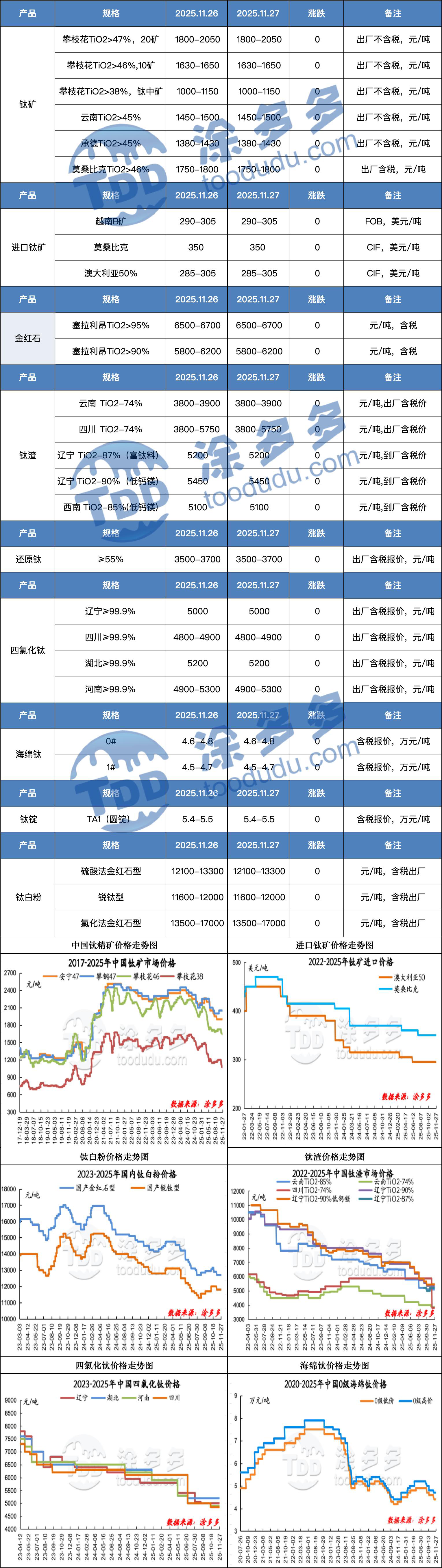 The Panzhihua-Xichang titanium ore price index stood at 1847.50, remaining unchanged as domestic prices stabilize amid supply shortages in some mines, while imported ore prices weaken due to low demand. In the titanium slag market, November’s bidding price rose slightly to 5,450 yuan/ton, yet overall conditions remain weak with persistent cost pressures and muted demand. Titanium tetrachloride holds steady at 4,800–5,300 yuan/ton despite rising production costs. Titanium sponge prices are stable, with Grade 1 at 45,000–47,000 yuan/ton and Grade 0 at 46,000–48,000 yuan/ton, supported by existing orders. The titanium dioxide market sees a new price surge, with major producers including Longbai Group raising prices by 700 yuan/ton due to high raw material costs, signaling strengthening upward pressure. Market stability prevails across most segments, but cost-driven price hikes loom as demand recovery remains slow.