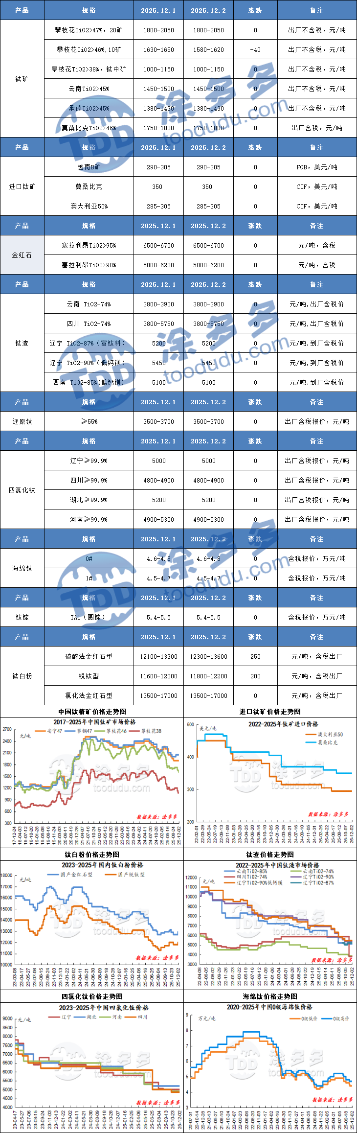 北方企业高钛渣11月招标价为5450元/吨,较10月上涨10元/吨。钛渣市场弱稳运行,钛富料供应充足。12月总招标量为1万吨。