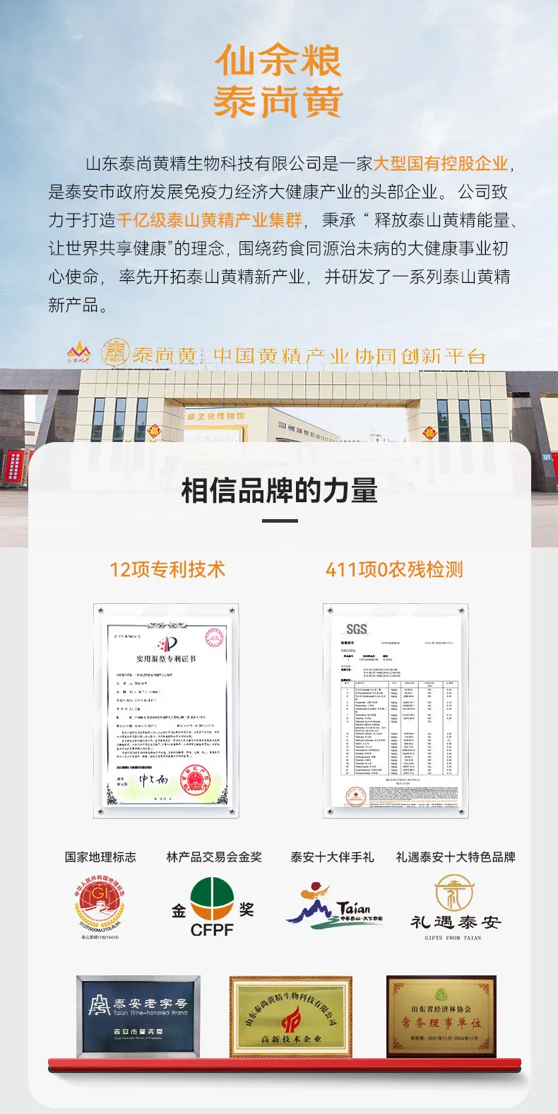 | 主要产品 | 山东泰尚黄精生物科技有限公司是一家大型国有控股企业,是泰安市政府发展免疫力经济大健康产业的头部企业,国家现代产业园核心区、国家林下经济示范基地。公司秉承“释放泰山黄精能量、让世界共享健康”的理念,致力于打造百亿级泰山黄精产业集群,围绕药食同源治未病的大健康事业初心使命,扛牢国企责任,守正创新;率先开拓了泰山黄精新产业,创建了全产业链三产融合发展新模式,实现了泰山黄精产业化发展的新突破,创造了黄精丝新品类,研发了一系列泰山黄精新产品。公司是中国中医药信息学会药食同源分会理事长单位、中国黄精产业化协同创新平台发起单位、中国产学研合作创新示范基地、山东省经济林协会黄精分会会长单位、山东省省级产业化联合体、省级扶贫龙头企业、泰山黄精国家地理标志商标授权使用单位。 | ||